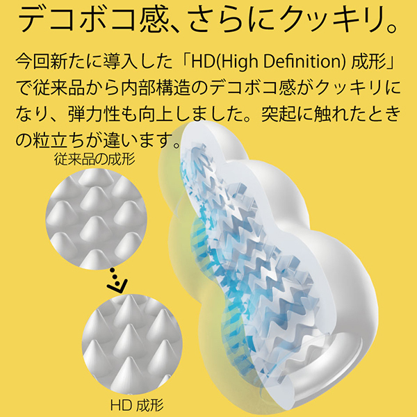 全てが新しくなったプッチ。ポケットサイズのローション不要ホールプッチシリーズが生まれ変わって新登場。軟性素材から内部の構造、パッケージ、全てが新しくなりました。デコボコ感、さらにクッキリ。今回新たに導入した「HD(High Definition)成形」で突起のデコボコ感がさらにクッキリになりました。突起に触れたときの粒立ちが違います。弾力感、さらにモッチリ。「HD 成形」により軟性樹脂の弾力性も向上。さらにモッチモチに、しなやかな素材になりました。内部構造も、さらにハッキリ。オリジナルシリーズ、スイーツシリーズ計8種類の内部構造をより精密な造形にリニューアル。「HD 成形」とあいまってデコボコ感がよりハッキリわかる構造になりました。生産工場を一新。新型プッチシリーズは日本国内に新設した工場から生産。最新の設備と厳密な品質管理で一つ一つ丁寧に作ります。ローション不要、必要なのは水だけ。ローション不要軟性素材「プラスウェッチ」水分が付着すると潤い成分が反応、ねっとりした潤いに包まれます。<オクトパス内部構造>「張り巡らされた吸盤が吸い付く」吸盤とイボが密着し快感を生み出す