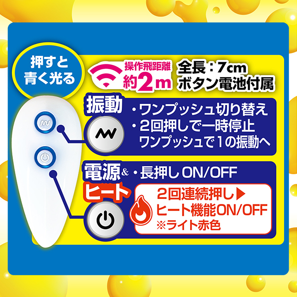 挿れたままで動かさずにイケる!挿れっぱでクリもナカも!挿れたらあとは快感に浸るだけ!!!ナカから人肌温度で快感を高められるヒート機能付き。振動はクリ&ナカ全体に伝わる多彩な8振動。<クリ部分>親指大の突起と貝殻のような形状がクリ&Uスポを刺激。<ナカ部分>さざ波のような形状がナカ全体のあらゆるポイントに優しくフィット。Gスポ、裏Gスポ、Aスポ周辺を激しく振るわせ、絶頂快感へ誘います。なめらかなシリコンコーティングでお肌にも優しくフィット。遠隔操作できるオシャレなリモコン付き。下着に仕込んでお散歩&お仕置きプレイにもオススメ♪動かさずに挿れっぱでLet’sイキっぱ!!!・ヒート機能付き・リモコン付属(操作飛距離約2m)・生活防水・USB充電式(充電時間:約120分/連続使用時間:約45分)※使用状況や環境により時間が変わる場合があります。※本体底部の電源部分には水が入らないようにしてください。