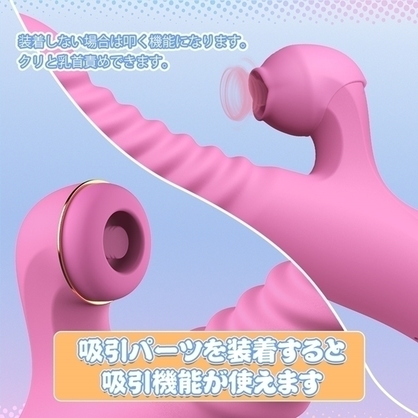 中イキ、ク●イキの欲張り2点攻めバイブ。厳選したシリコン素材を使用し自然で持ちやすい形状。7種の伸縮振動モード、7種の叩きパターンでナカ・ク●同時開発しちゃいましょう!ク●刺激部分のシリコンカバーが取り外し可能でシリコンカバーを外すと4000回/分の叩き機能になり、シリコンカバーを付けると吸引機能になるのが特長です。また、ぬくもりを感じるヒート機能を搭載しているので寒い日でも冷たくなく、人肌の暖かさで挿入感がよりリアルに感じられます。ち●内をしっかりと刺激してほしい人、中イキがしてみたい人、新たな開発をしたい人、パワフルな刺激で弾けたい人におすすめです!※生活防水仕様なのでご使用後はしっかり水洗いが出来ます。