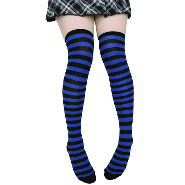 コスチュームのアクセントに!ブルー×ブラックのボーダー柄ニーハイ。1cm幅の細めボーダーがとってもキュート!コスプレ衣装はもちろん、私服にもコーディネート出来ちゃう優れもの!ヘビロテ確実のしましま柄ニーハイソックスです。※こちらの商品は在庫の状況によりお届けまでに4日〜7日程度かかる場合がございます。